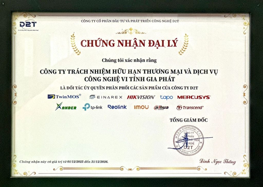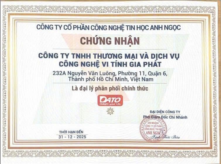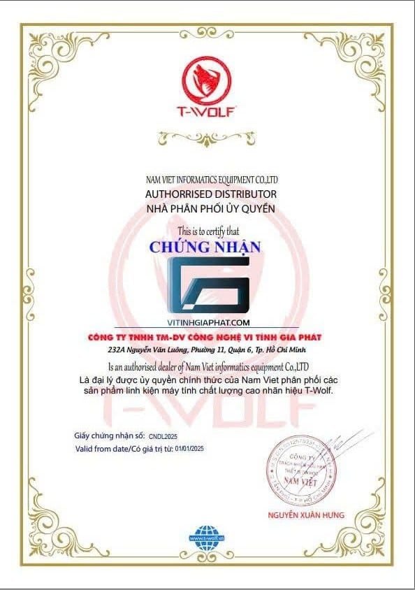 Việc được chứng nhận là đại lý phân phối chính thức của các thương hiệu uy tín như Dato, SSTC, T-Wolf, Winnfox, VSP, D2T... là minh chứng rõ nét nhất cho cam kết về chất lượng và nguồn gốc sản phẩm của chúng tôi. Gia Phát cam kết sẽ tiếp tục nỗ lực không ngừng để mang đến những sản phẩm linh kiện vi tính chính hãng, chế độ bảo hành ưu việt và giải pháp công nghệ tối ưu nhất cho Quý khách.
