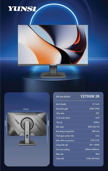 Yunsi Y270GW 2K 27 inch Phẳng 100Hz (1ms, HDMI-DP, CHÂN BẰNG) - màu Trắng / Đen