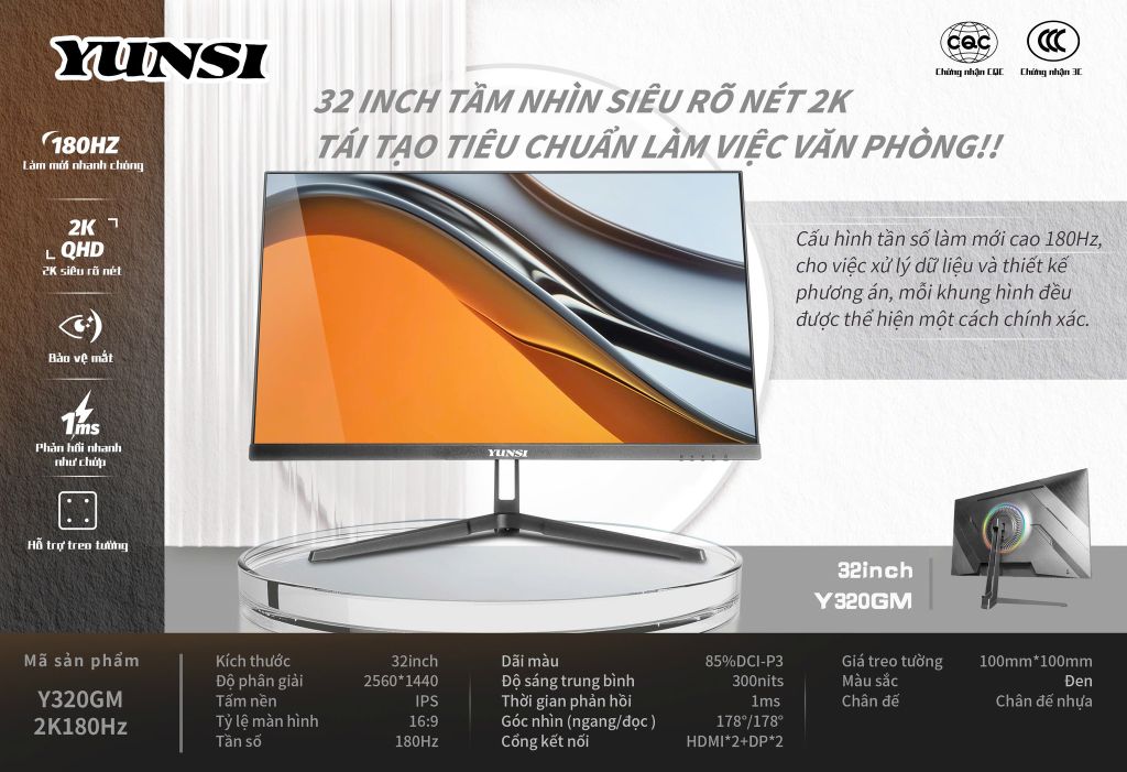 Yunsi Gaming Y320GM 2K 180Hz (QHD, IPS, HDMI + DP, 1ms) - Màu đen