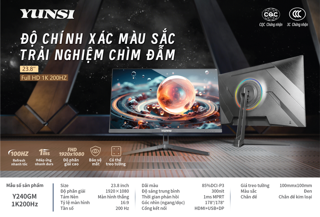 Yunsi Y240GM 24 inch Phẳng 200Hz (FHD, 1ms, HDMI-DP-USB) - Màu đen