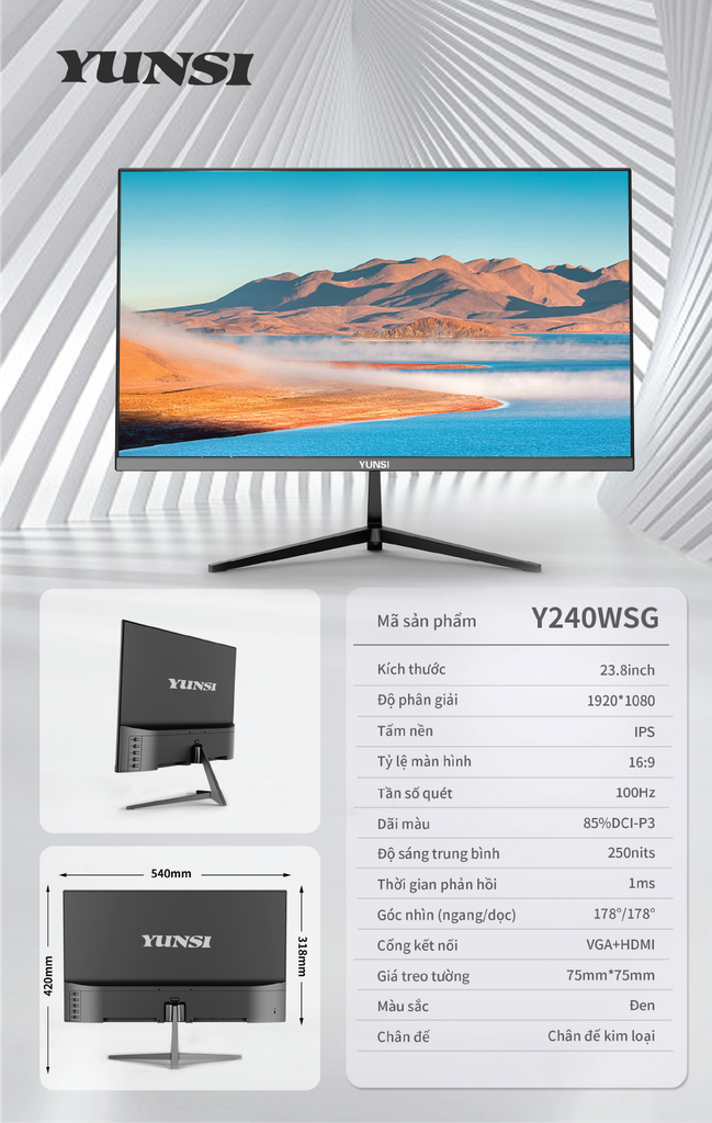 Yunsi Y240WSG 24 inch 100Hz Phẳng (FHD, IPS, 1ms, VGA+HDMI) - Màu đen