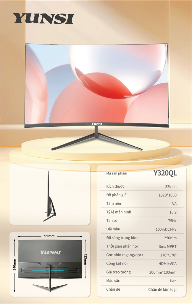 Yunsi Y320QL 32 inch Cong (60Hz, 4K, 2ms, HDMI-VGA) - Màu đen